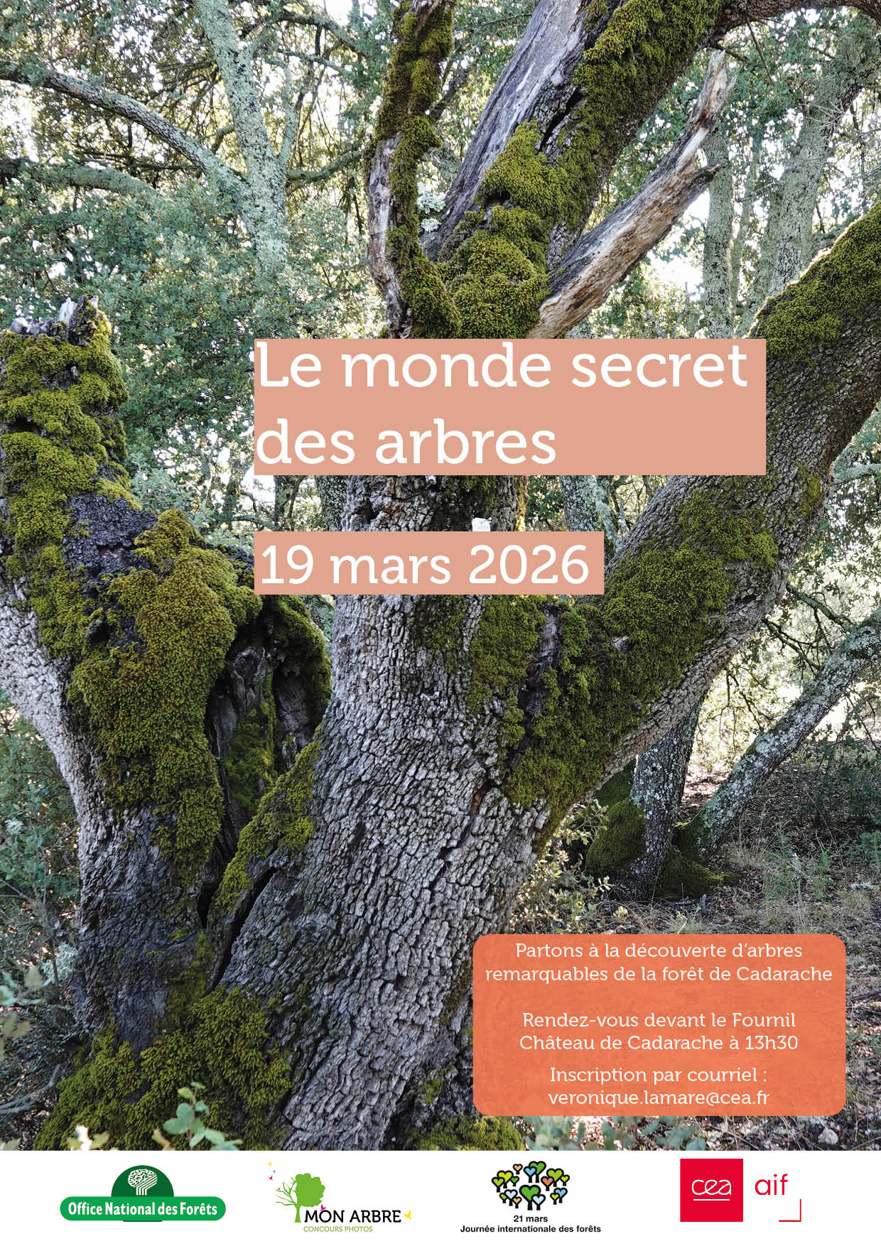 Les inscriptions sont ouvertes pour participer à l'animation du 19 mars sur le parcours biodiversité au château de Cadarache. Cette séance de printemps prend place dans le cadre de la Journée Internationale de la forêt et de l'édition 2026 du concours photos Mon Arbre. Espérons que la météo soit clémente !